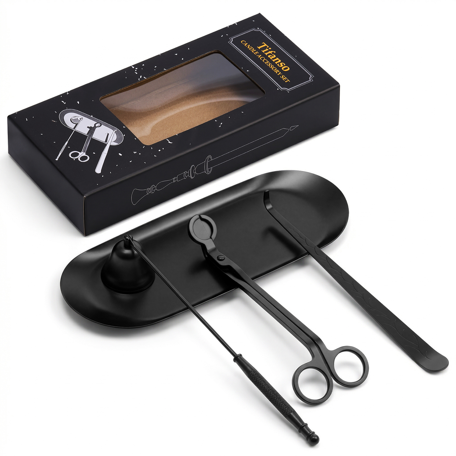 0 review for tifanso 4-in-1 Candle Care Kit with Wick Trimmer Cutter, Extinguisher Snuffer, Dipper and Storage Tray Plate, Stainless Steel Wick Scissors Accessories with Gift Package for Candle Lovers (Black)