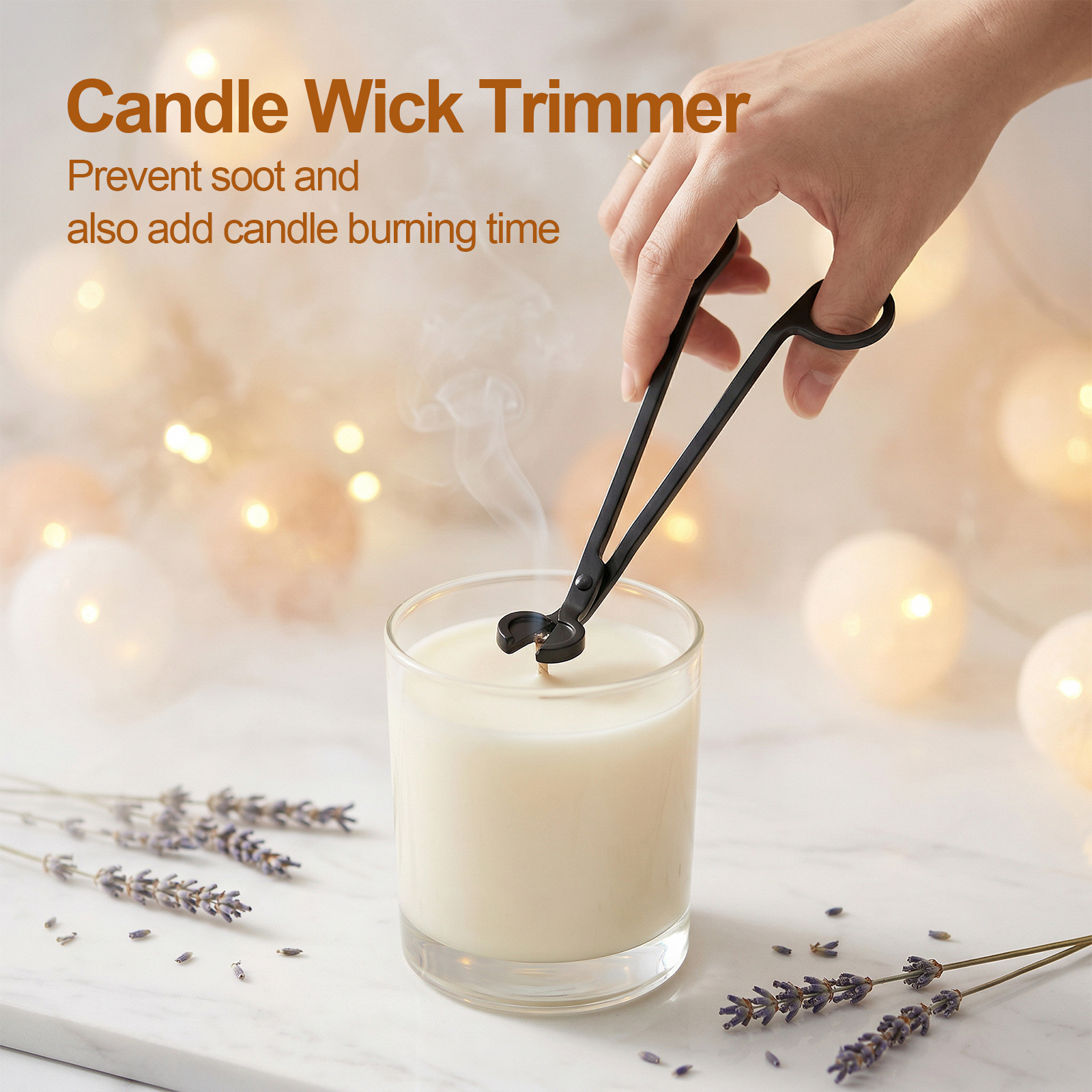 Candle wick trimmer is equipped with rounded safety blades. As a key candle accessory, it effortlessly trims wicks to the optimal length. Precise trimming with this wick trimmer or candle scissors for wick prevents black smoke and ensures an even burn.