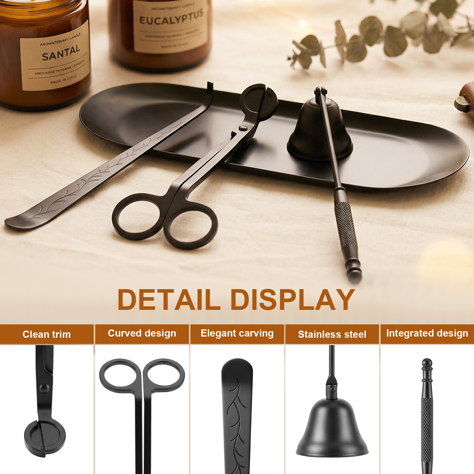 Tifanso's newly launched candle care kit is tailored for you who seek the ultimate burning experience. This candle accessory set is more than just candle tools; it's a complete candle kit designed to elevate your ritual. From precisely trimming wicks and elegantly extinguishing flames to gently cleaning the wax surface, every step reflects our thoughtful attention to detail. This candle trimmer set not only enhances your candle's performance but also transforms maintenance into a mindful ceremony.