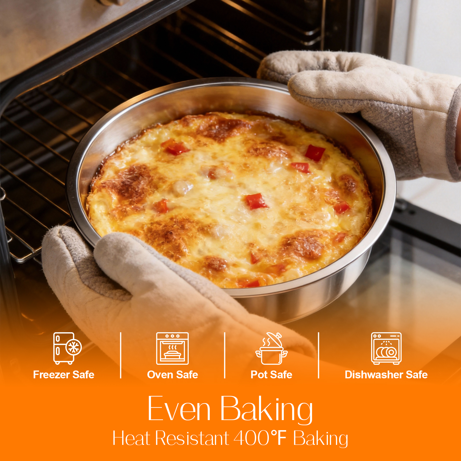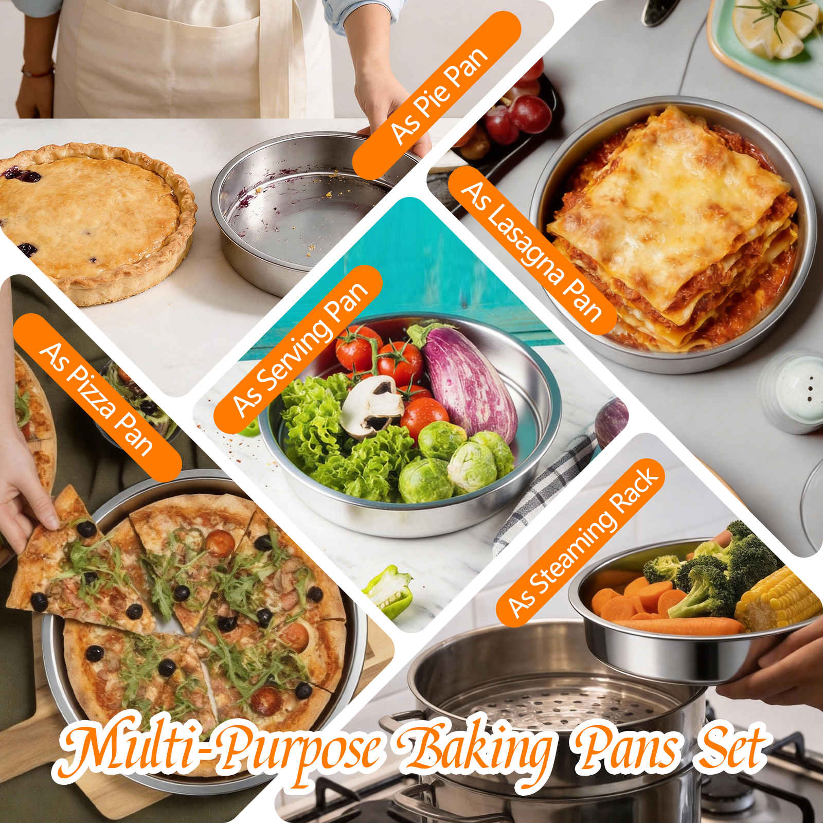 Crafted from healthy, heavy-duty stainless steel, this baking pans set is built to last. The set of 3 is ideal for creating layer cakes for weddings, birthdays, and celebrations. Beyond baking, use them as deep pie pans, fruit containers, or serving dishes. Ideal for both beginners and professionals, these versatile cake baking pans handle everything from homemade and boxed cakes to cornbread and more.